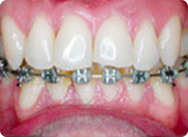 Brackets linguales superiores y brackets convencionales metálicos abajo.